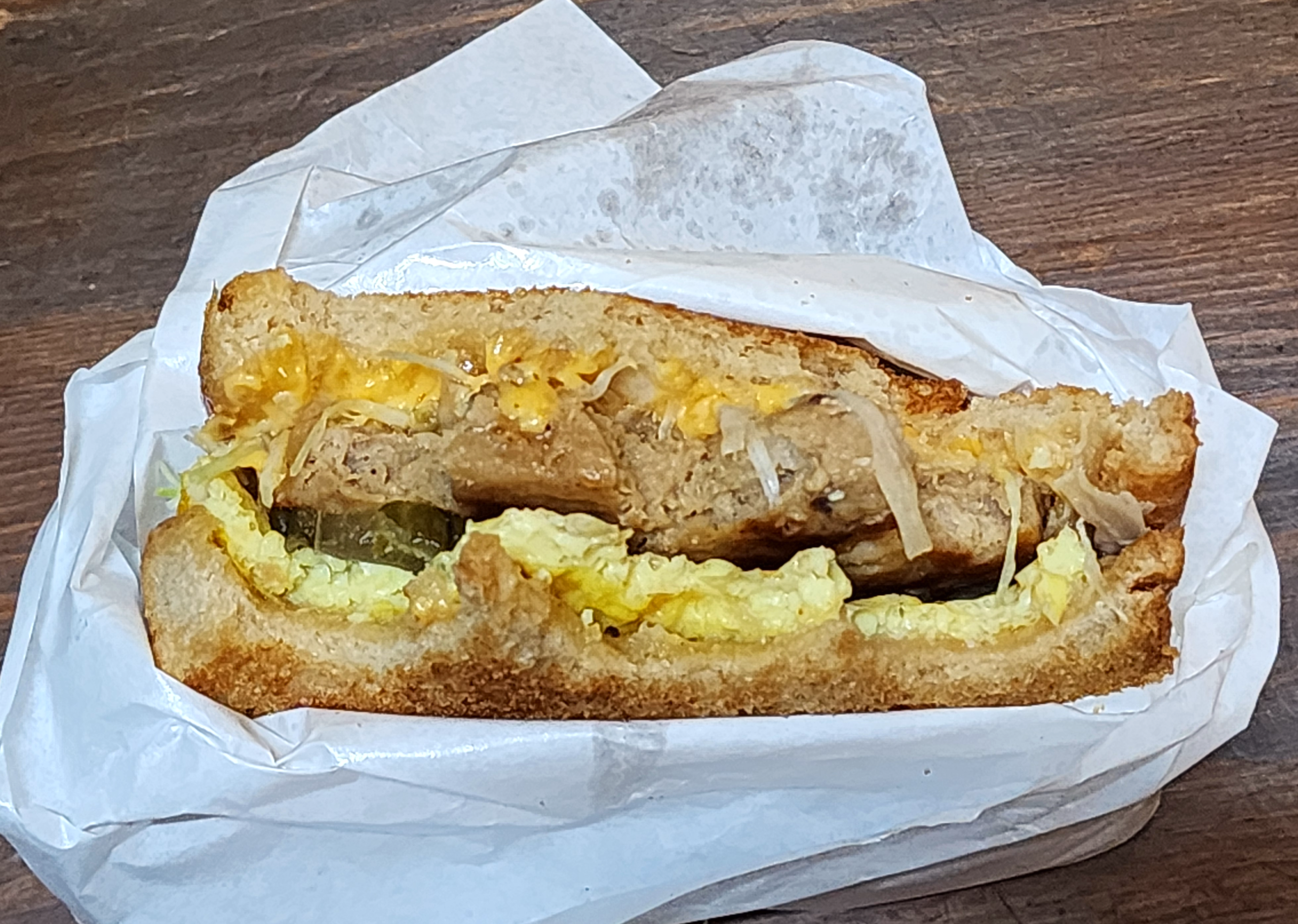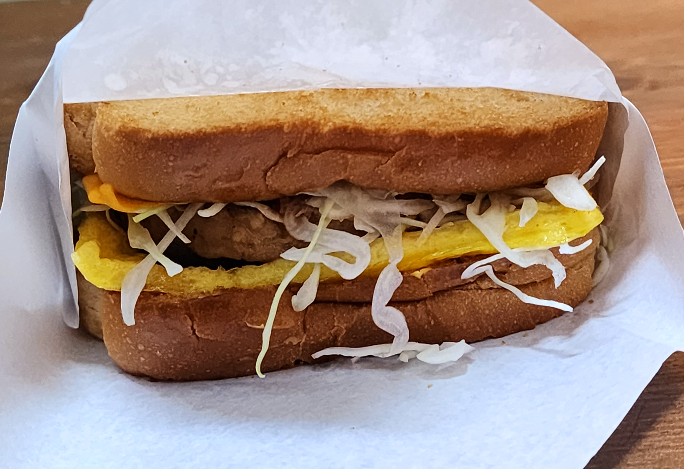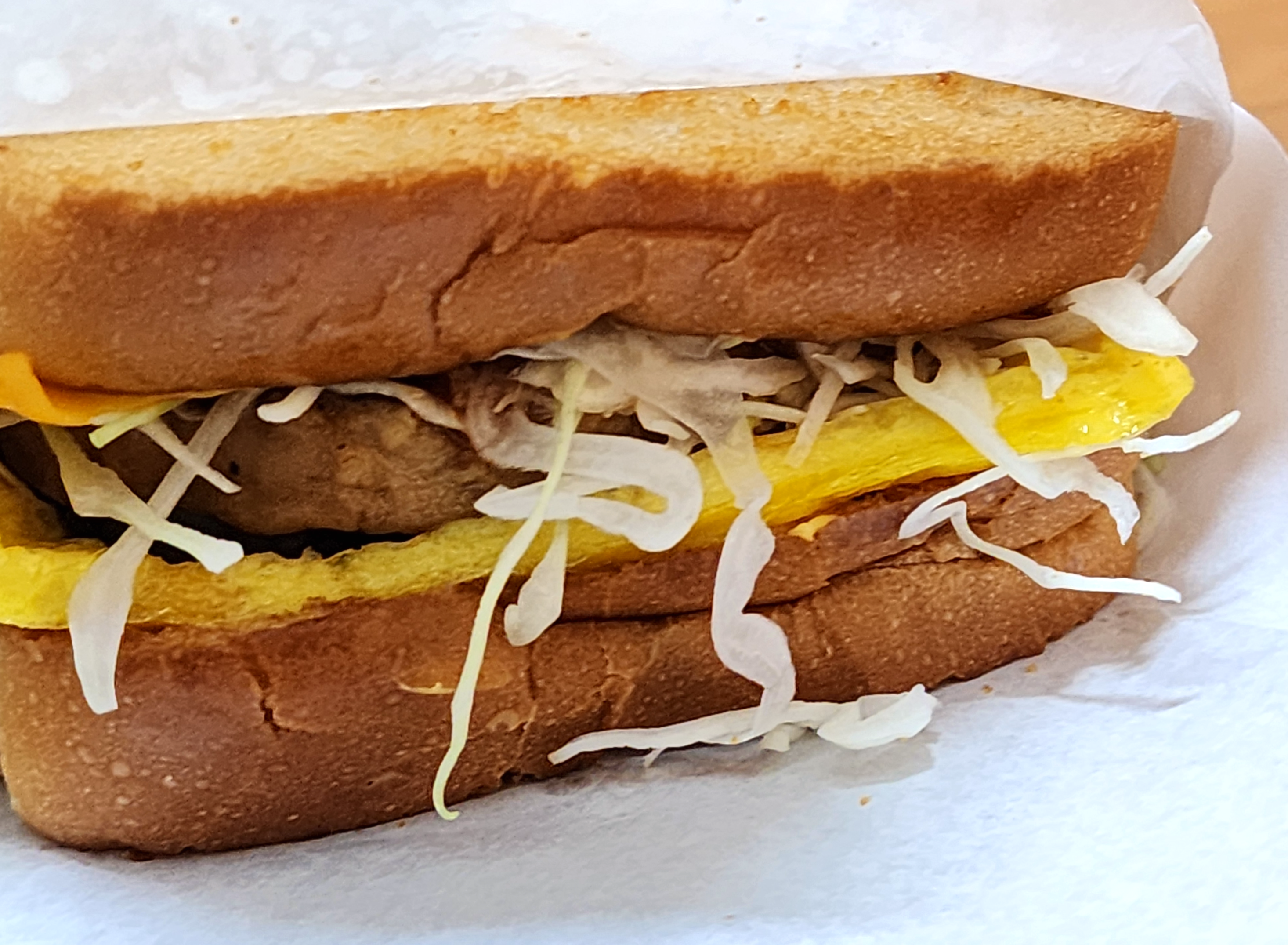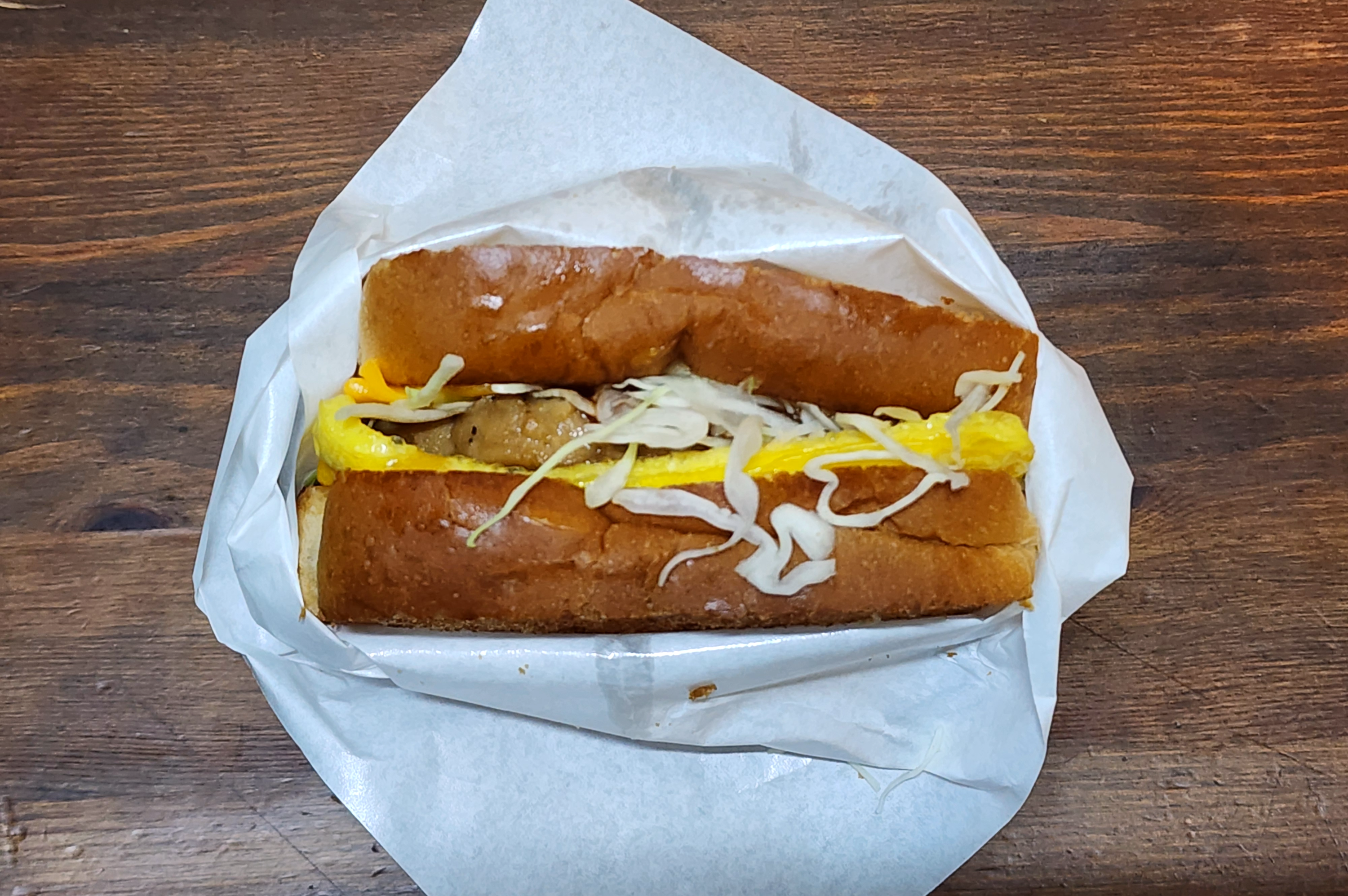 토스트 한 빵에 치즈 한 장, 계란, 양배추, 피클, 옥수수콘